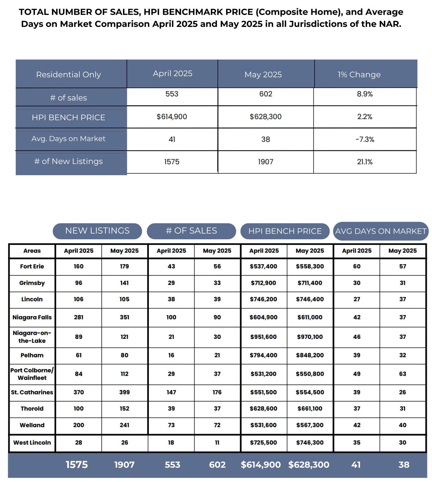 Residential home sales activity recorded through the MLS® for the Niagara Association of REALTORS® (NAR) totalled 602 units in May 2025, compared to 553 in April 2025. In May, the Niagara Association of REALTORS® listed 1907 residential properties compared to 1575 in April 2025. The average days it took to sell a home in May 2025 was 38 days, a 7.3% decrease from April 2025. "May’s numbers reflect a market that is gradually regaining momentum. Buyers are adjusting to current interest rates, and the increase in new listings is giving them more options to consider. With a sales-to-new-listings ratio of 31.5%, Niagara remains in overall buyer’s market territory, making strategic pricing more critical than ever for sellers. The slight drop in average days on market is a positive sign that many sellers are paying attention to price and successfully motivating buyers off the fence. As always, market conditions vary by community and property type, so consulting a REALTOR® who understands the local dynamics is key to navigating today’s real estate landscape. The MLS® Home Price Index (HPI) tracks price trends far more accurately than is possible using average or median price measures. The overall MLS® HPI composite benchmark price for the Niagara Region was $628,300 in May 2025. This was a 2.2% increase from April 2025. The characteristics of the HPI composite benchmark is a home between the ages of 51 to 99 with three bedrooms and two bathrooms. A full list can be found in the accompanying chart.