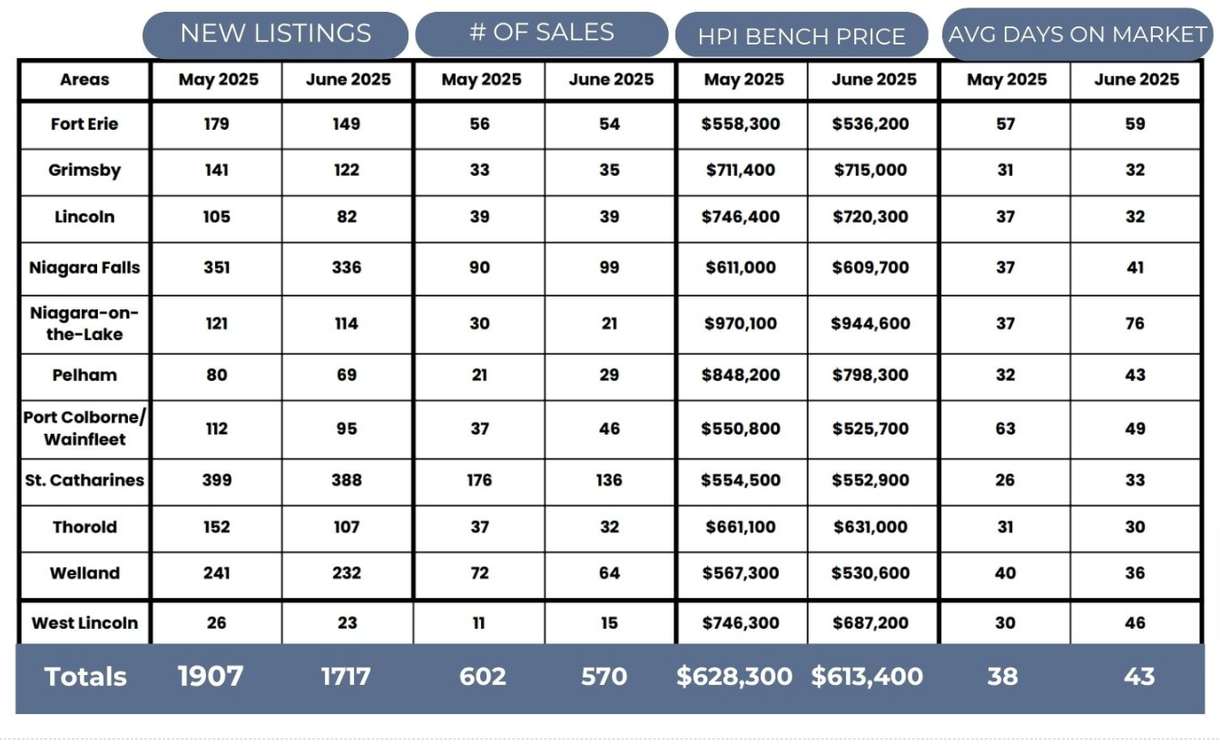 In June, the Niagara Association of REALTORS® listed 1,717 residential properties, down from 1,907 in May 2025. The average time it took to sell a home was 43 days — that’s a 13.2% increase from May.